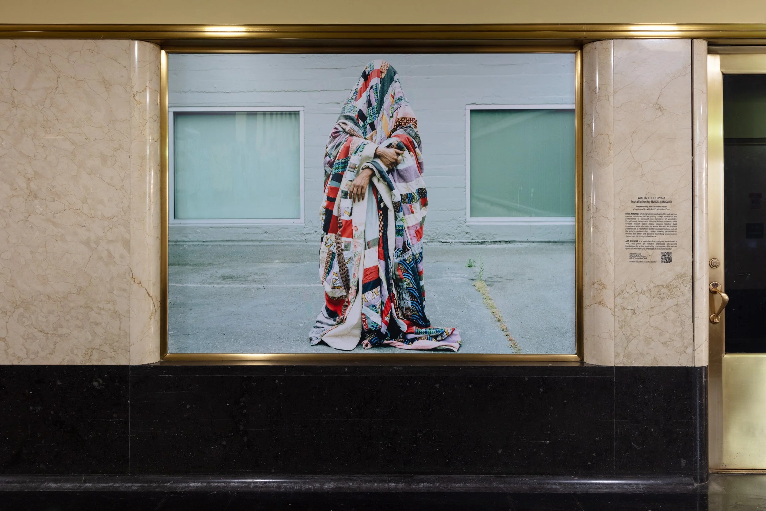 In conversation with the vitrine spaces, the 125-foot mural in the concourse of 45 Rockefeller Plaza features photographs showcasing miniature resin figurines of the artist holding charged postures; they extend the energy of joy, wonder, tenacity, and ambition outwards onto viewers. Detailed imagery highlighting the physically and emotionally laborious task of constructing such intricate quilts and embroideries can be viewed at 10 Rockefeller Plaza, 30 Rockefeller Plaza, 50 Rockefeller Plaza, and Radio Park. As part of the Art Sundae installation, the artist will also install The River, a monumental sculptural quilt in the 10 Rockefeller Plaza window.