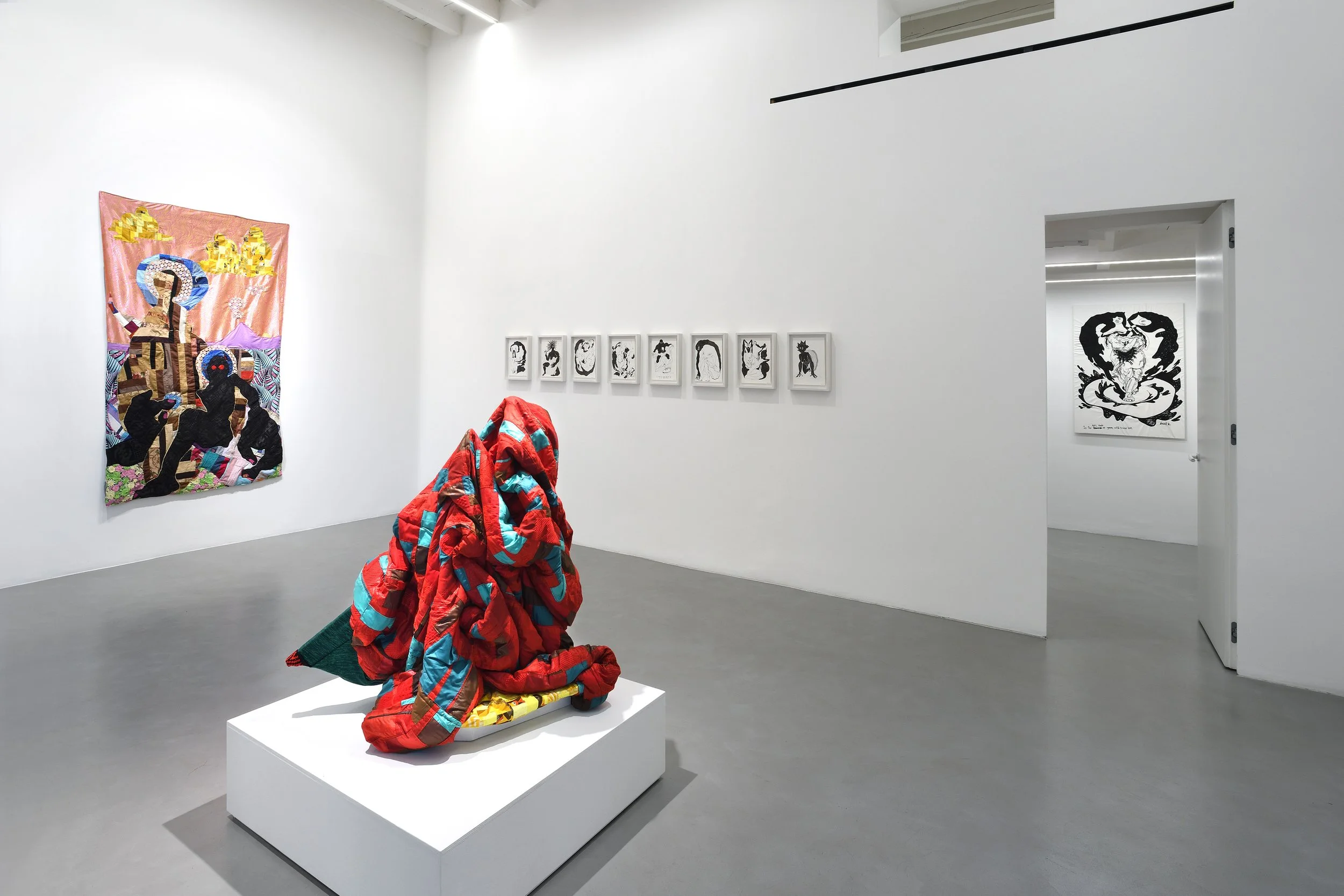 The Rolling Fields to My House employs the practice of ‘world building’ to create belonging. The quilts, the sculptures and the drawings displayed in the exhibition represent the inner communication cultivated by the artist to arrive at a place that had meaning for the only black kid in a class of whites. Kincaid’s move to Ghana in 2020 allowed him to revisit worlds previously developed and realised in new formats. The black entity that appears in these works is a solid root of self and observer: an omniscient witness in harmony with all the versions of self permeates the exponential dimensions. Arguably, an ever-present body that planned to encounter and explore the polychromatic nature of the black diaspora identity in various terrains, this time in Italy.